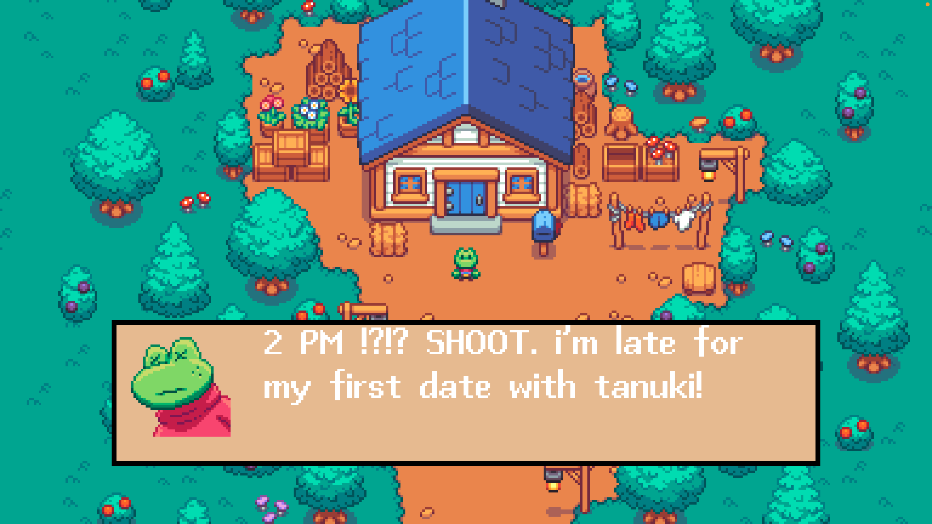 This game is an interactive top-down 2D story-based game about Frog trying their best to do everything right to have the perfect first date with their crush Tanuki but completely blows it by being late to their date. Now Frog is stuck in a time loop restarting their day over and over again, so now Frog is trying everything to make sure this first date is perfect.